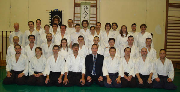A Misogi Aiki Dojo 10 éves, jubileumi edzésén készült felvétel (a régi és a jelenlegi misogisokkal) - középen, öltönyben Makó Ferenc sensei (4. dan).